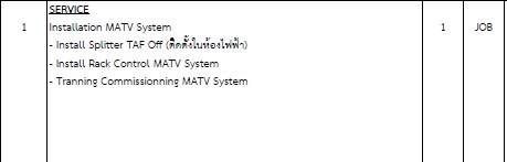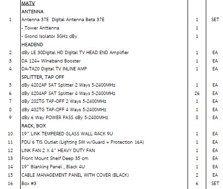 เเละอยากจะขอใบเสนอราคาในระบบดังกล่าวค่ะเนื่องจากทางโครงการได้สอบถามข้อมูลเกี่ยวกับระบบ MATV เข้ามา