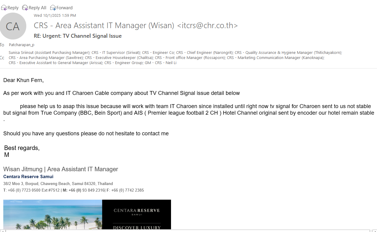 - รายละเอียด ลูกค้าแจ้งให้ช่วยตรวจสอบ และสรุปสาเหตุ เรื่องสัญญาณทีวีของเจริญส่งมาให้เราไม่เสถียร แต่สัญญาณจากบริษัท True (BBC, Bein Sport) และ AIS (Premier league football 2 CH ) Hotel Channel ต้นฉบับส่งโรงแรมของเรายังคงมีเสถียรภาพ