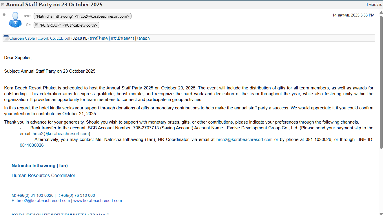 ลูกค้าขอของสนับสนุน พื้นที่ ภูเก็ต 120000069222 บริษัท อีโวลว ดีเวลลอปเม้นท์ กรุ๊ป จำกัด Kora Beach Resort Phuket