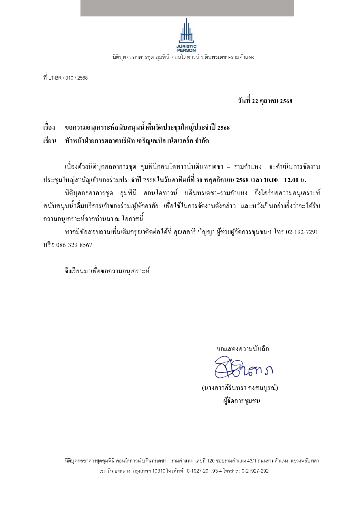 เนื่องจากทางนิติบุคคลอาคารชุดลุมพินี คอนโดทาวน์ บดินทรเดชา - รามคำแหง ได้กำหนดให้มีการจัดงานประชุมใหญ่สามัญเจ้าของร่วมประจำปี 2568