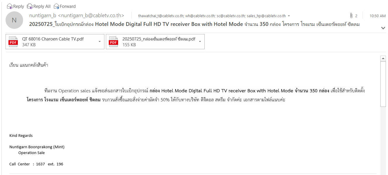 รบกวนประสานงานสั่งซื้อกล่อง STB สำหรับโครงการ เซนเตอร์พ้อย ชิดลม