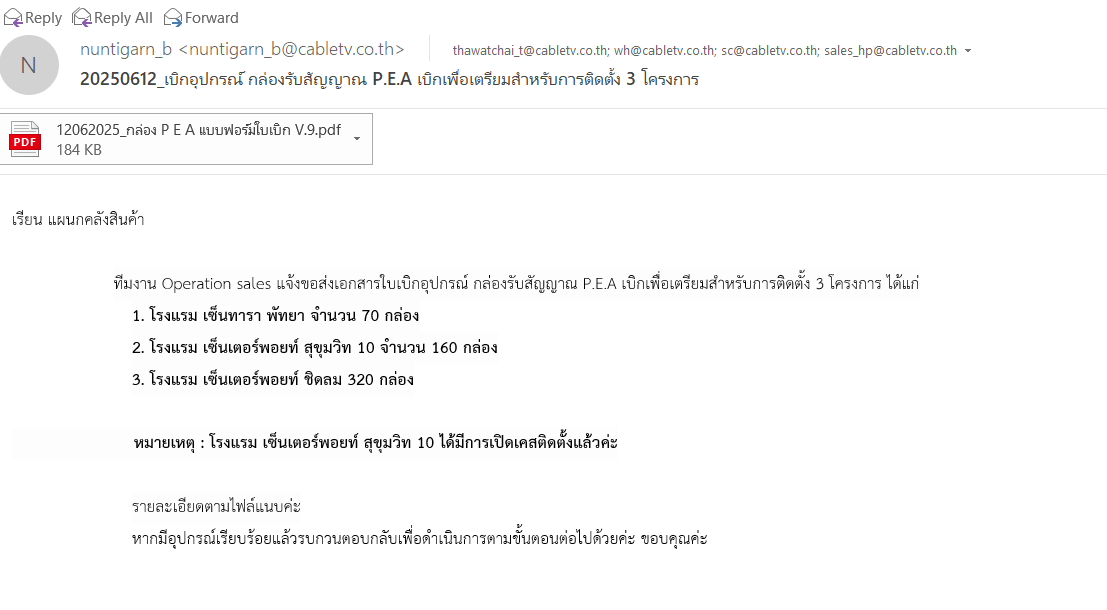รบกวนตั้งงเบิกอุปกรณ์กับทางคลังสินค้า รายละเอียดตามเอกสารแนบค่ะ