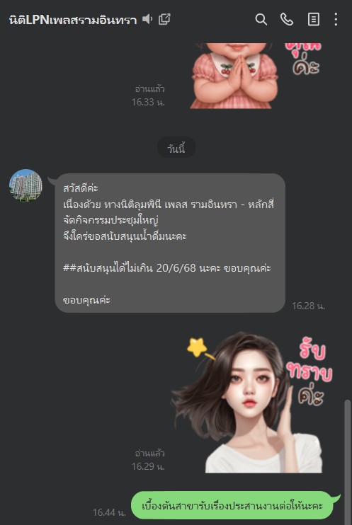 openขอสนับสนุนน้ำดื่มการจัดประชุมใหญ่ของโครงการ ประจำปี 2568 - นิติบุคคลอาคารชุด ลุมพินี เพลส รามอินทรา-หลักสี่