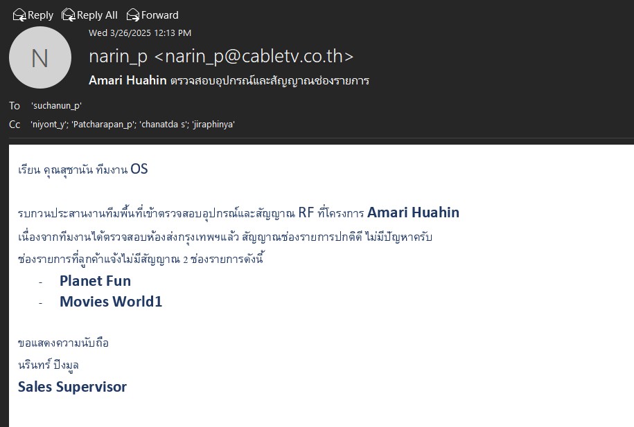 เนื่องจากทีมงานได้ตรวจสอบห้องส่งกรุงเทพฯแล้ว สัญญาณช่องรายการปกติดี ไม่มีปัญหาครับ