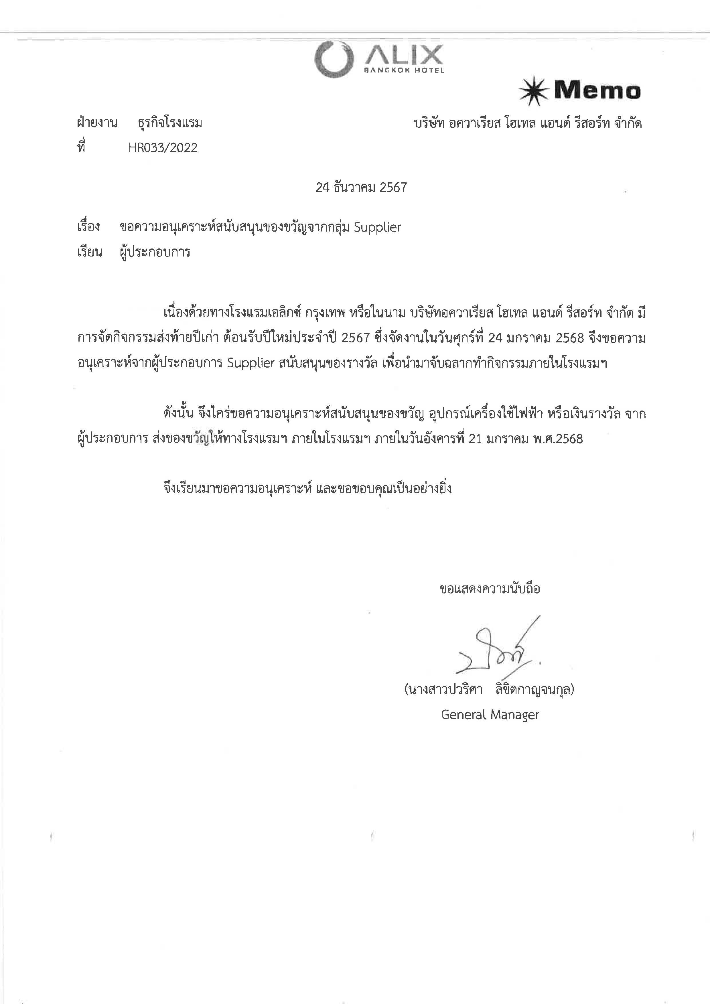 openขอส่งหนังสือสนับสนุนของขวัญปีใหม่ โครงการ ALIX BANGKOK HOTEL