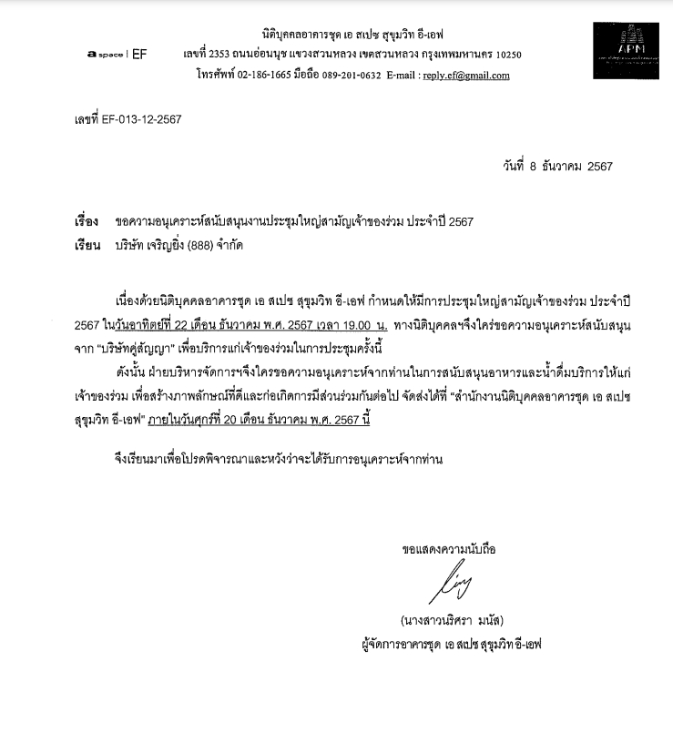 เนื่องด้วยนิติบุคคลอาคารชุด เอ สเปซ สุขุมวิท อี-เอฟ กำหนดให้มีการประชุมใหญ่สามัญเจ้าของร่วม ประจำปี 2567 ในวันอาทิตย์ที่ 22 เดือน ธันวาคม พ.ศ. 2567 เวลา 19.00 น. ทางนิติบุคคลฯจึงใคร่ขอความอนุเคราะห์สนับสนุนจาก บริษัทคู่สัญญา เพื่อบริการแก่เจ้าของร่วมในการประชุมครั้งนี้