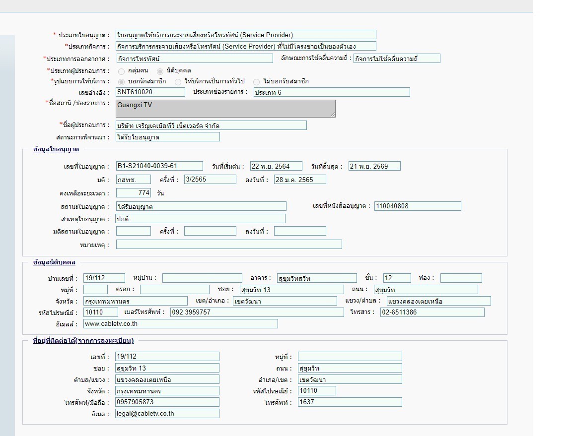 openสอบถามเรื่อง ลิขสิทธ์ Guangxi TV ปี 2568 ทาง กสทช ยังไม่ได้รับเอกสารใบรับอนุญาติ นายเนชันสรณ์ บุรพานนทชัย 0805550375 เป็นเจ้าหน้าที่ กสทช ฝ่ายผังรายการทีวี รบกวนติดต่อกลับทางเจ้าหน้าที่ กสทช ให้ด้วยค่ะ